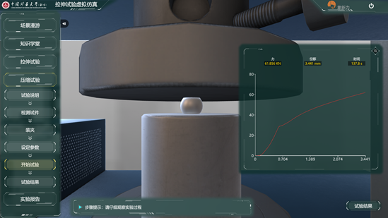 本实验项目以真实实验室设备及场景为对象,完全还原实验细节,将材料拉伸性能测试和压缩性能测试实验操作的流程场景虚拟与测试结果仿真计算相结合。学生在虚拟实验平台上学习材料拉伸及压缩性能测试的实验原理及操作方法,同时掌握各种材料拉伸及压缩性能指标及不同材料的性能差异。